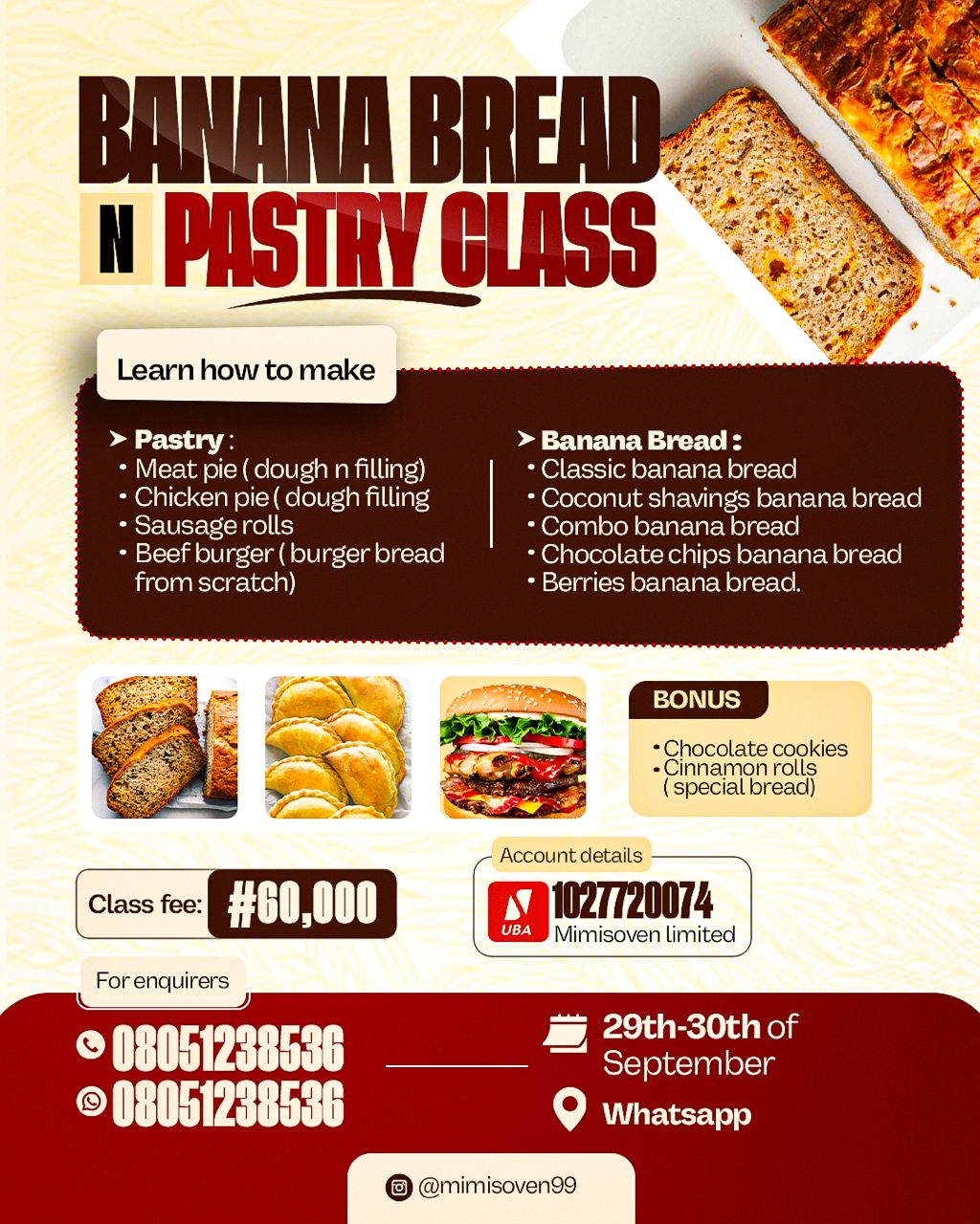 BANANA BREAD PASTRY CLASS Learn how to make ➤ Pastry: Meat pie (dough and filling), Chicken pie (doughand  filling Sausage rolls Beef burger (burger bread from scratch) > Banana Bread: Classic banana bread Coconut shavings banana bread Combo banana bread...