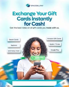 By admin December 21, 2025 No Comments SPACEBILLPAY Exchange Your Gift Cards Instantly for Cash! Get the best rates on all gift cards you trade with us. Steam Cards Sephora and many more Credit Alert! +430000 Amazon Gift Cards Apple / iTunes Google Play